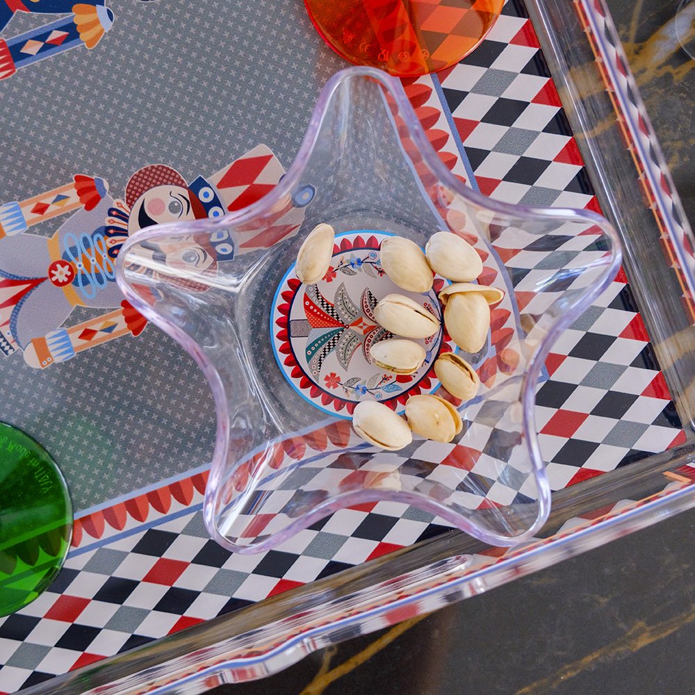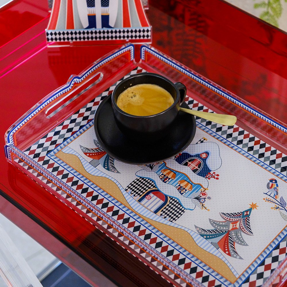 La tavola delle feste è un universo di armonia, fatto di sfumature, texture e decorazioni che dialogano tra loro. Il Vassoio piccolo Casetta, con i suoi bordi sagomati e l’illustrazione che passa dai toni freddi del blu al calore dell’oro, porta subito un tocco di poesia. È l’accessorio perfetto per servire antipasti, dolcetti o semplicemente per decorare la mise en place, creando un’atmosfera accogliente e ricercata.